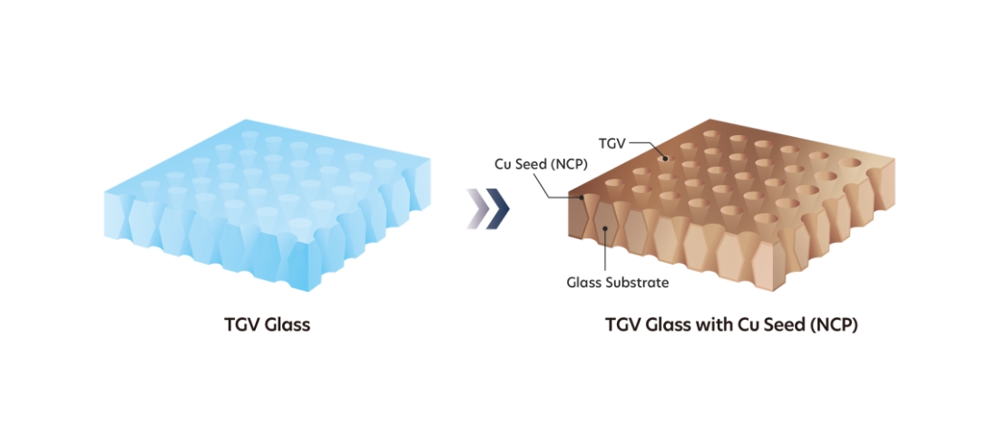 고밀착 Cu seed (NCP) 층을 TGV 벽면에 증착하여 도금의 밀착력을 향상시킴